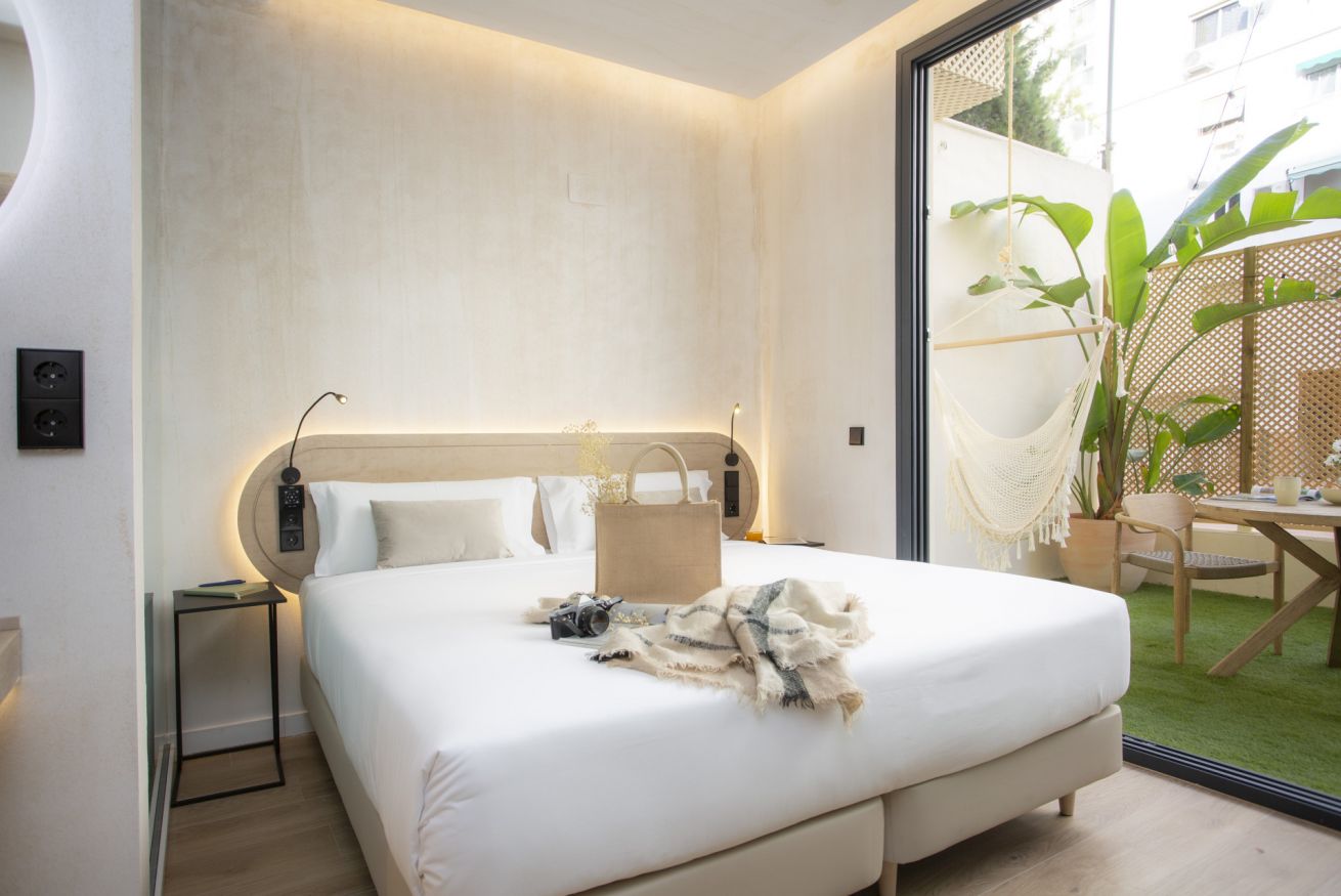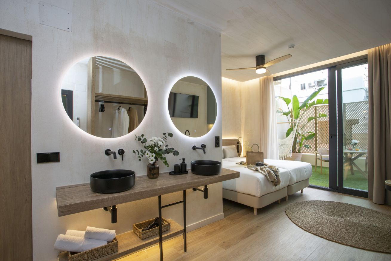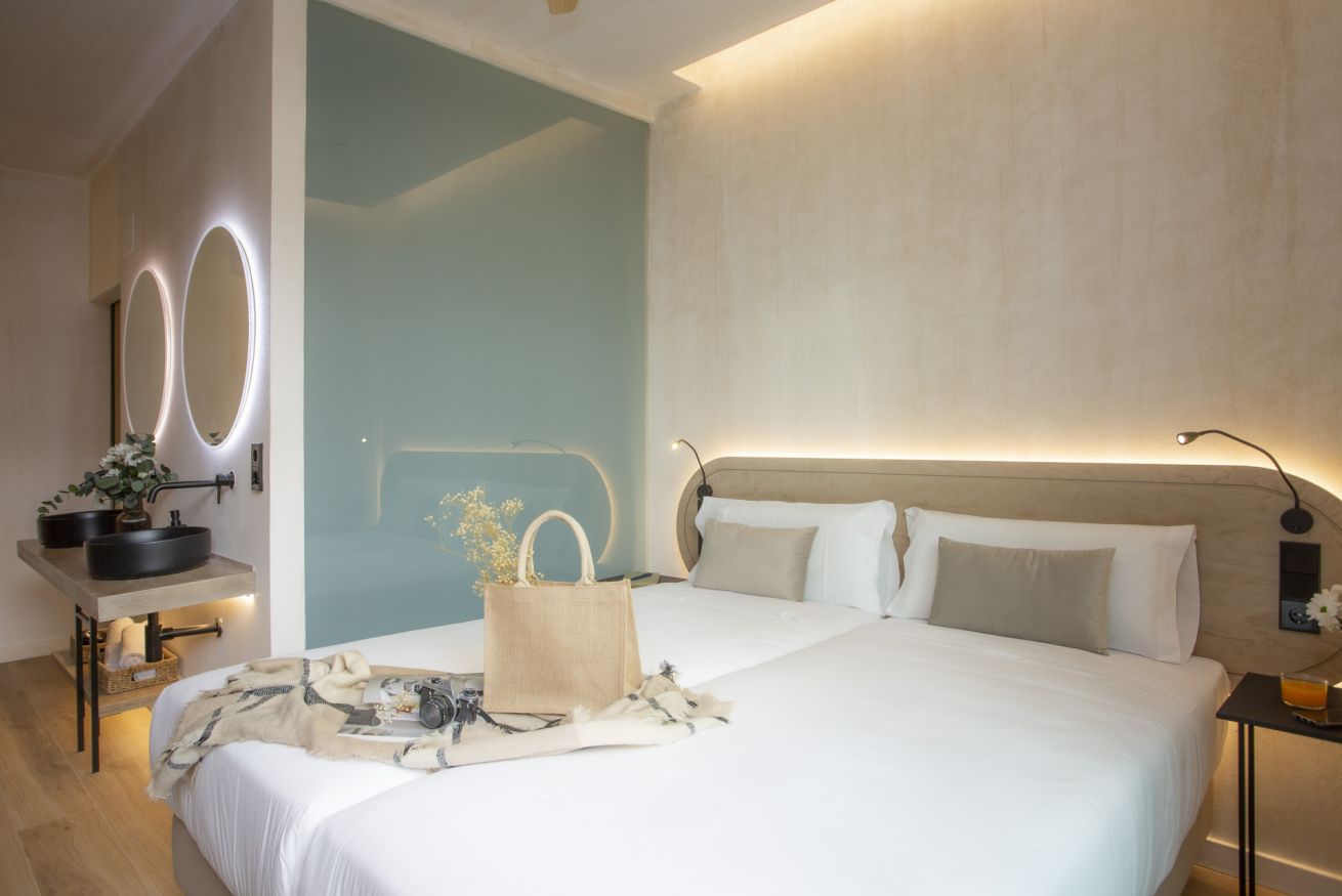 Descubre un espacio de diseño exclusivo y confort en este alojamiento boutique. La habitación doble, con dos cómodas camas de 90 x 200 cm, ofrece un descanso sin igual en un entorno exclusivo. Disfruta de tu propia terraza privada, un rincón lleno de luz natural ideal para trabajar, relajarte o desconectar de una jornada de turismo.